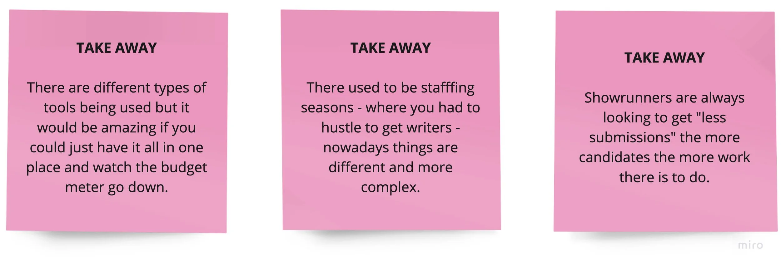 We watched over a dozen interviews with show runners in the Hollywood industry. Our team helped define the problem space from the research that was presented by the stakeholder.