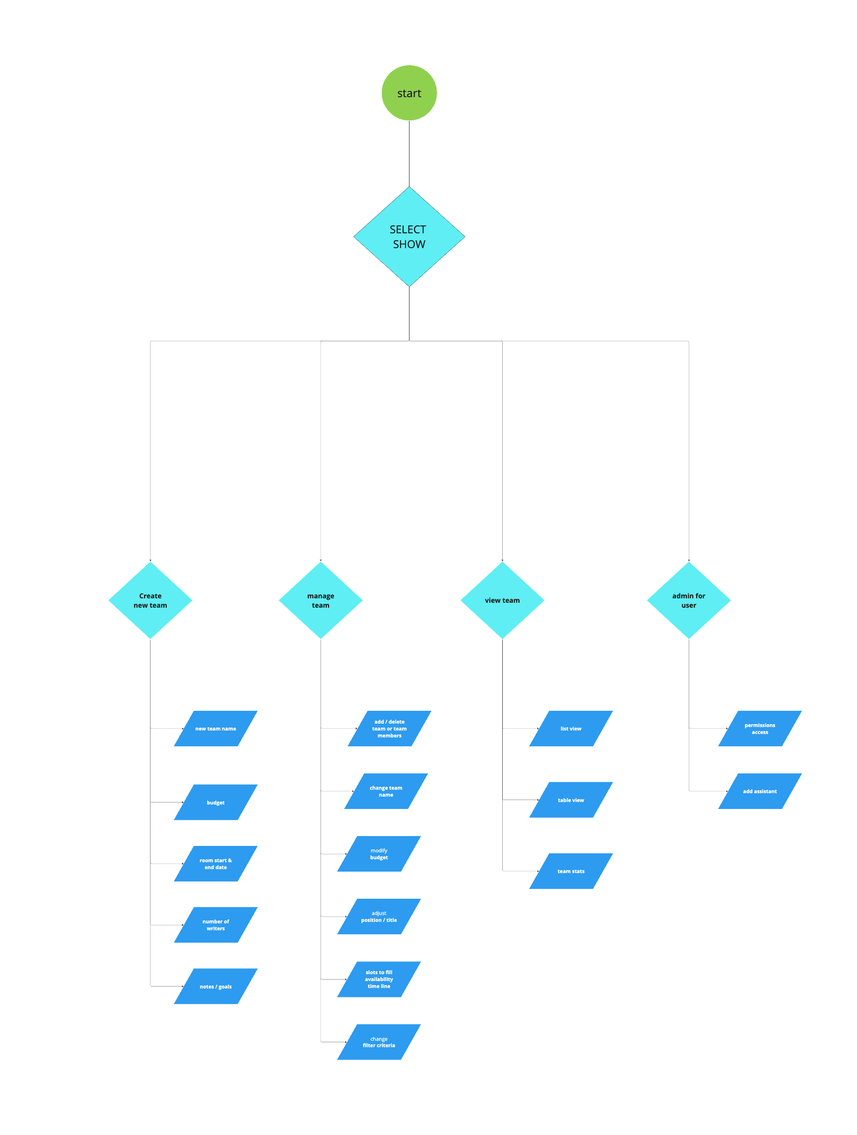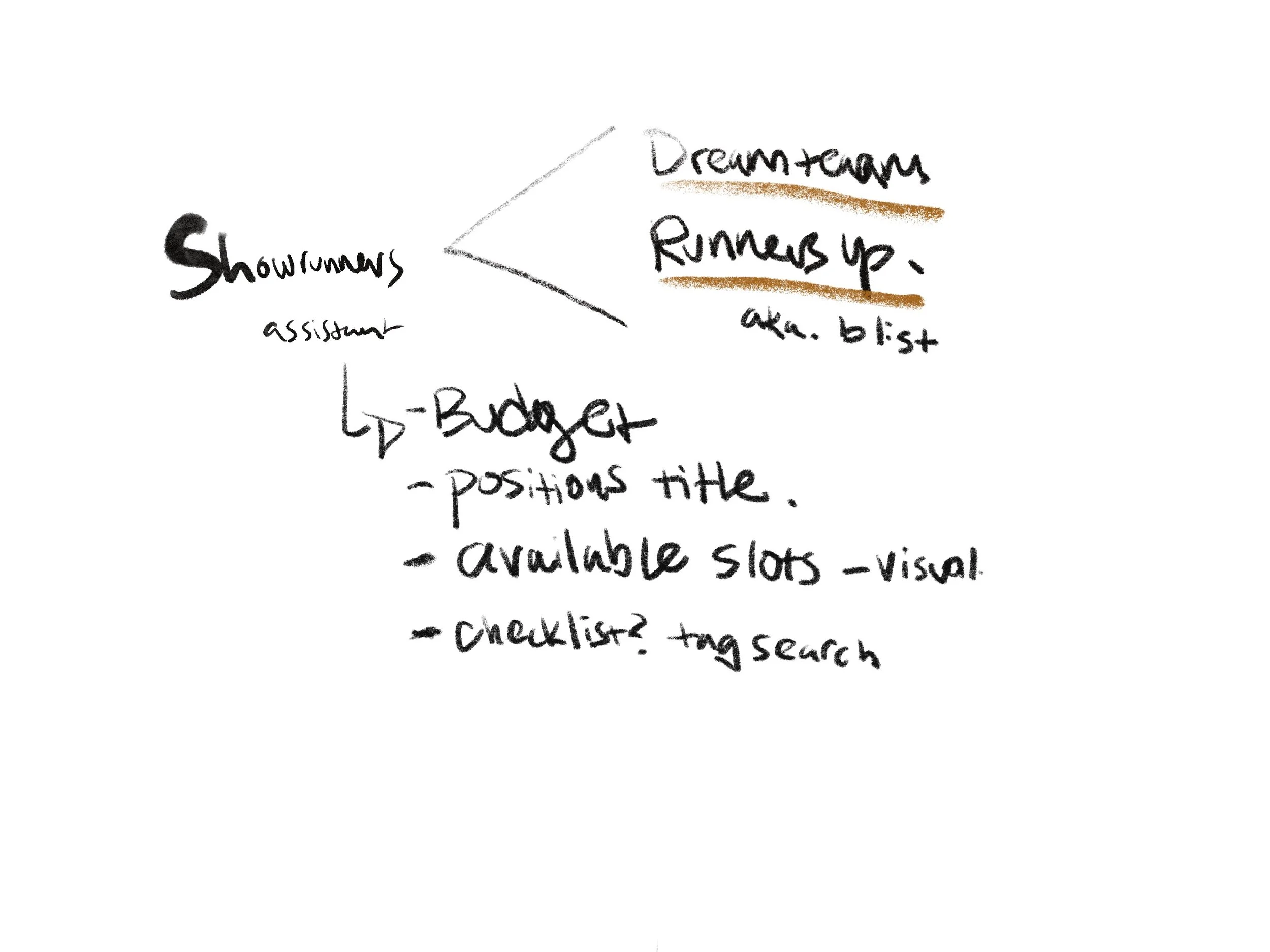 Our understanding of the complexities of how writers get hired for writing a show needed some work. Also, the client was having difficulty explaining this process. We had agreed to do some sketching as a team, but without a firm understanding of the process for team builder I had trouble focusing on what the low fidelity product might look like just yet.