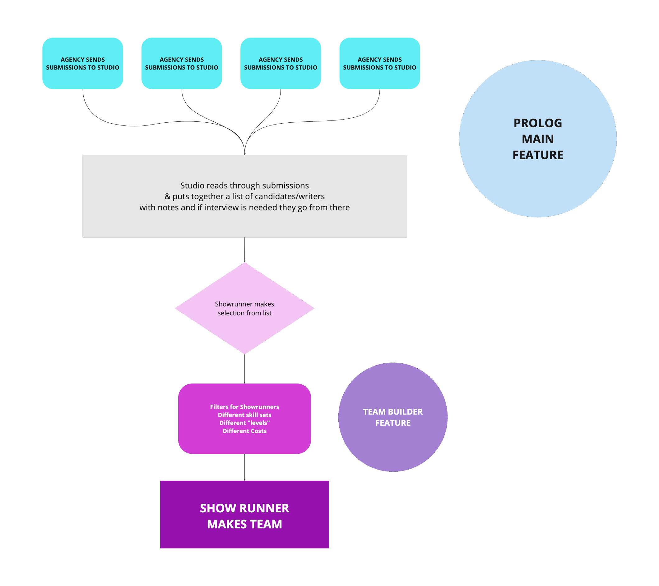 We needed to come to terms with how ProLog Version 1’s information hierarchy was operating. I explained ProLog Version 1 as an advanced phone book for Hollywood talent. Agencies and writers can create a profile that includes samples of their work. Production studios and Showrunners can then look through the phone book and make selections for candidates when staffing for future shows.